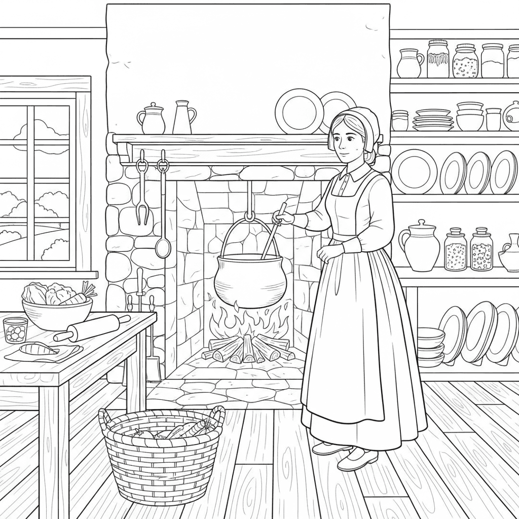 Vacker pilgrimskvinna som lagar mat i köket - färgläggningssida för barn och vuxna. Gratis att ladda ner och skriva ut.