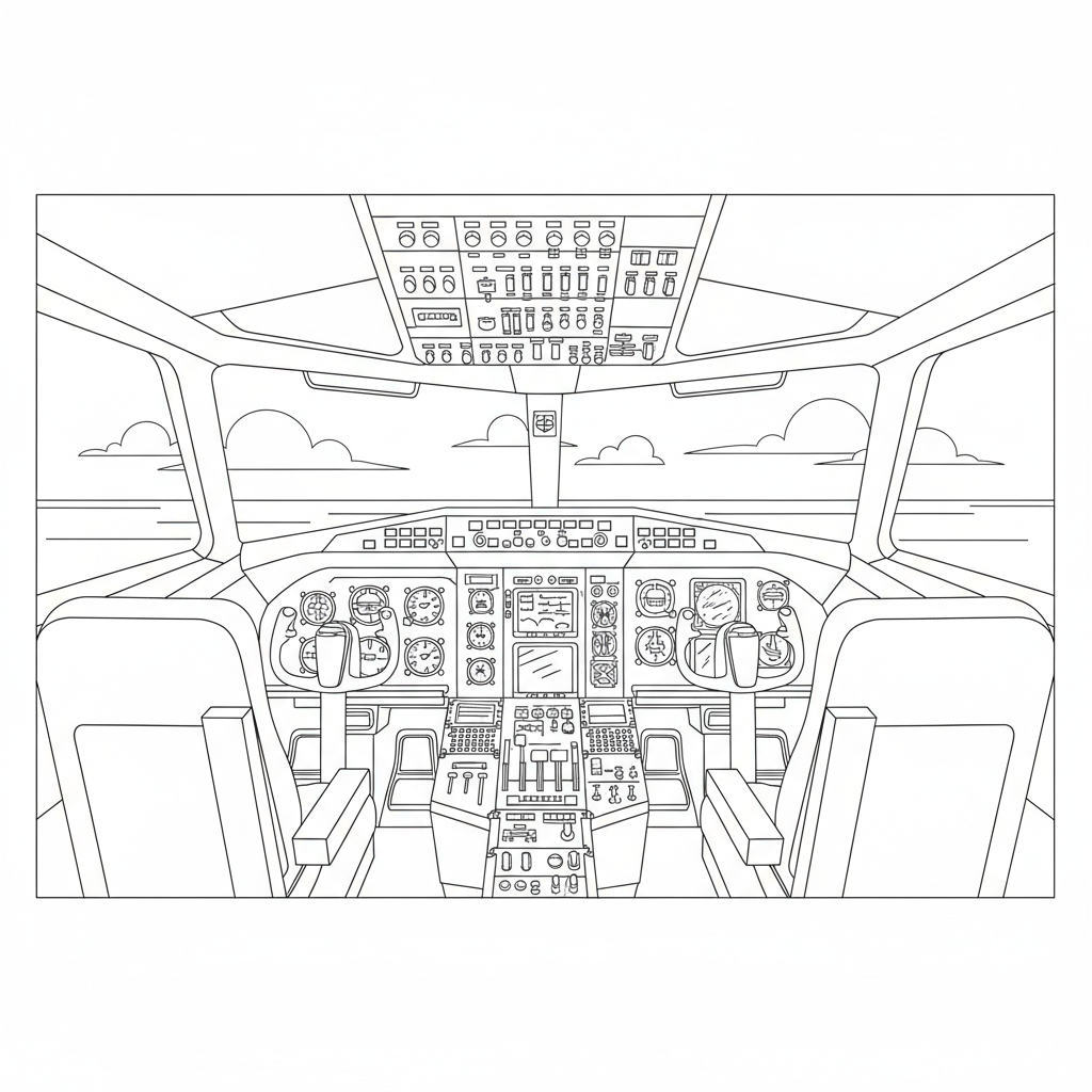 Beautiful airplane cockpit interior view coloring page for kids and adults. Free to download and print.