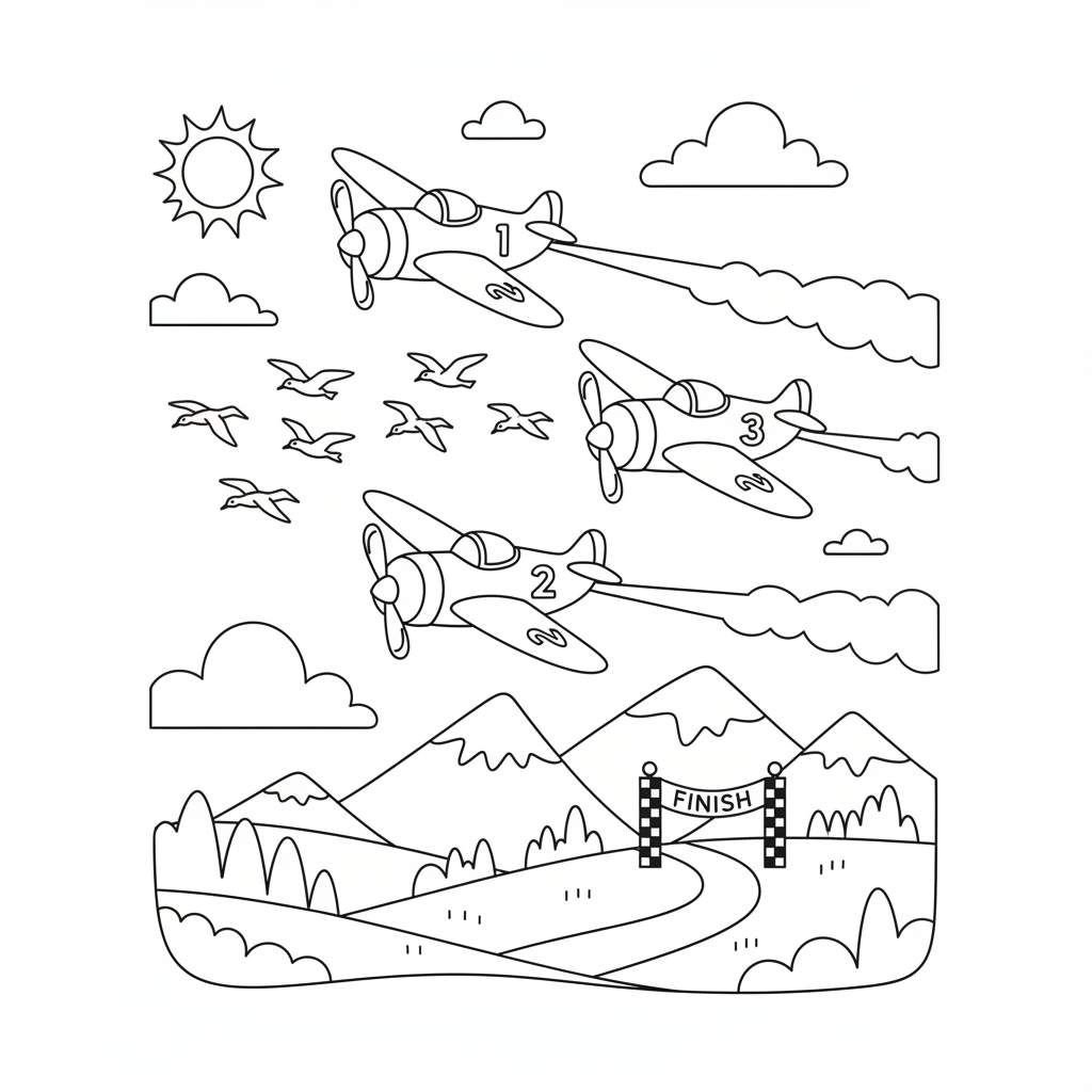 A delightful airplane coloring page featuring airplane racing with birds flying alongside in formation. Perfect for kids and adults who love coloring!
