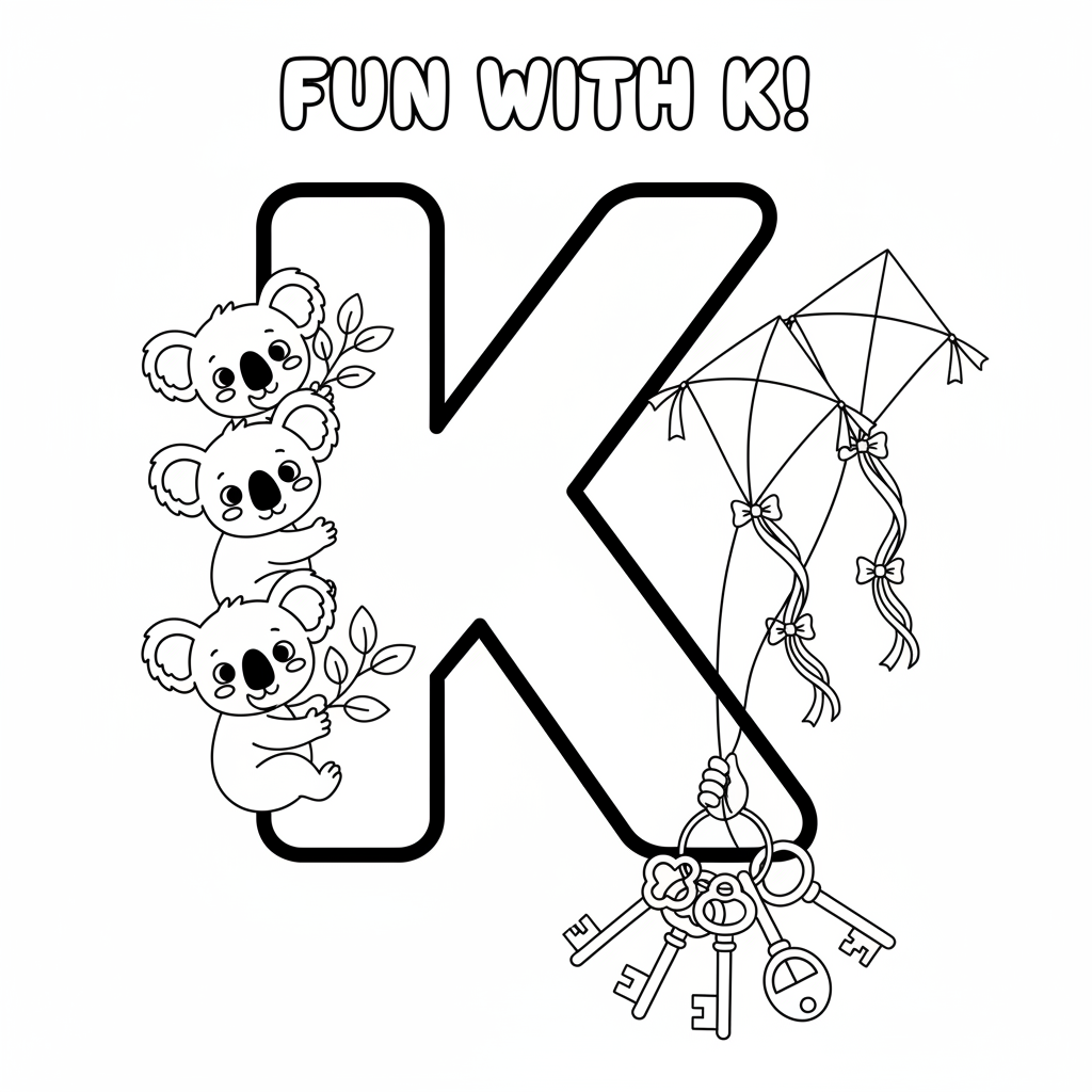 A delightful alphabet coloring page featuring letter K with kites koalas and keys fun illustration. Perfect for kids and adults who love coloring!