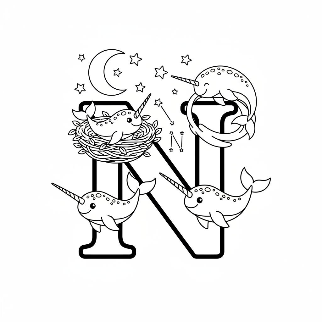 A delightful alphabet coloring page featuring letter N decorated with narwhals nests and night sky. Perfect for kids and adults who love coloring!