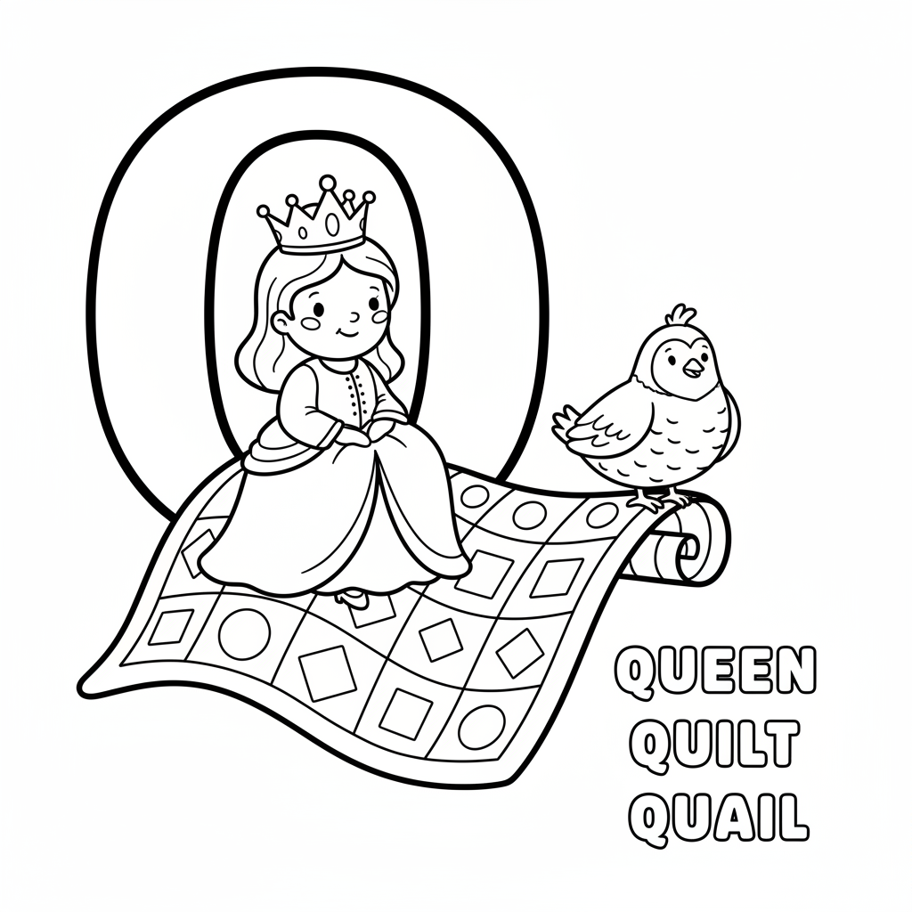 A delightful alphabet coloring page featuring letter Q with queen quilt and quail bird design. Perfect for kids and adults who love coloring!