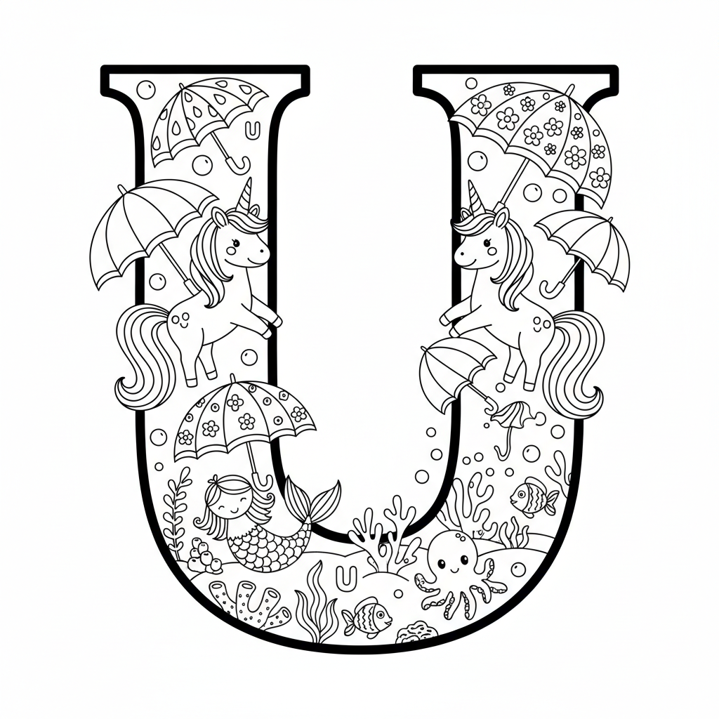 A delightful alphabet coloring page featuring letter U with unicorns umbrellas and underwater scene. Perfect for kids and adults who love coloring!