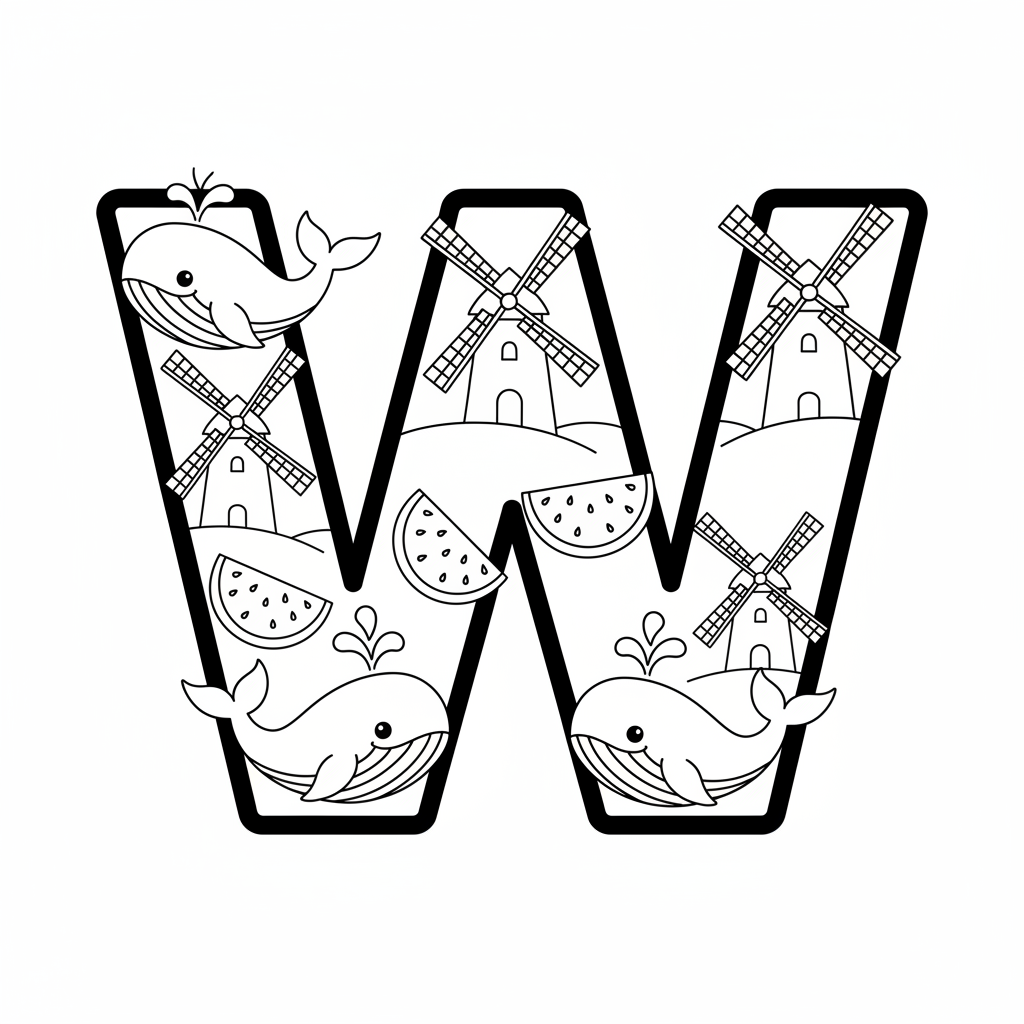 A delightful alphabet coloring page featuring letter W with whales watermelon and windmills design. Perfect for kids and adults who love coloring!