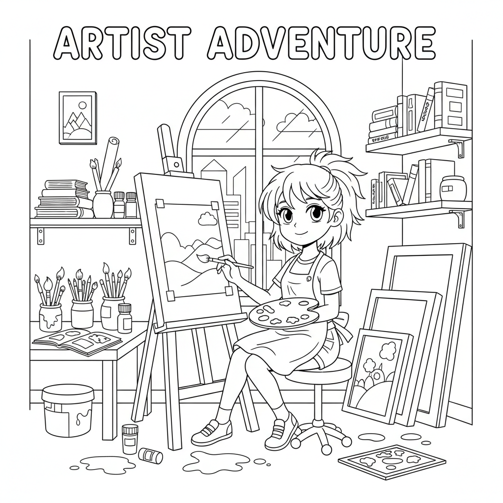 A delightful anime girl coloring page featuring anime girl painting on a canvas in an art studio surrounded by supplies. Perfect for kids and adults who love coloring!