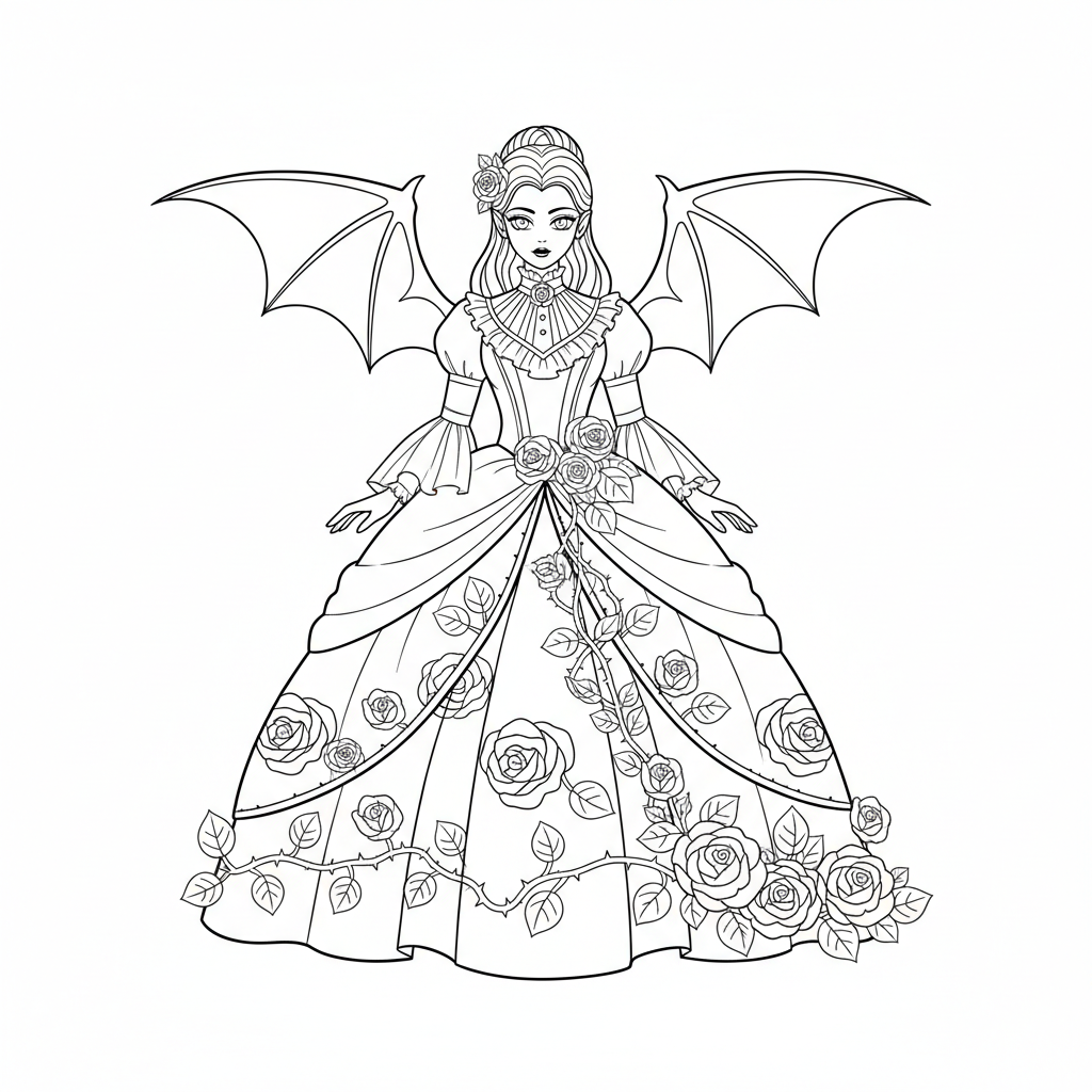 A delightful anime girl coloring page featuring anime vampire girl in elegant Victorian dress with bat wings and roses. Perfect for kids and adults who love coloring!