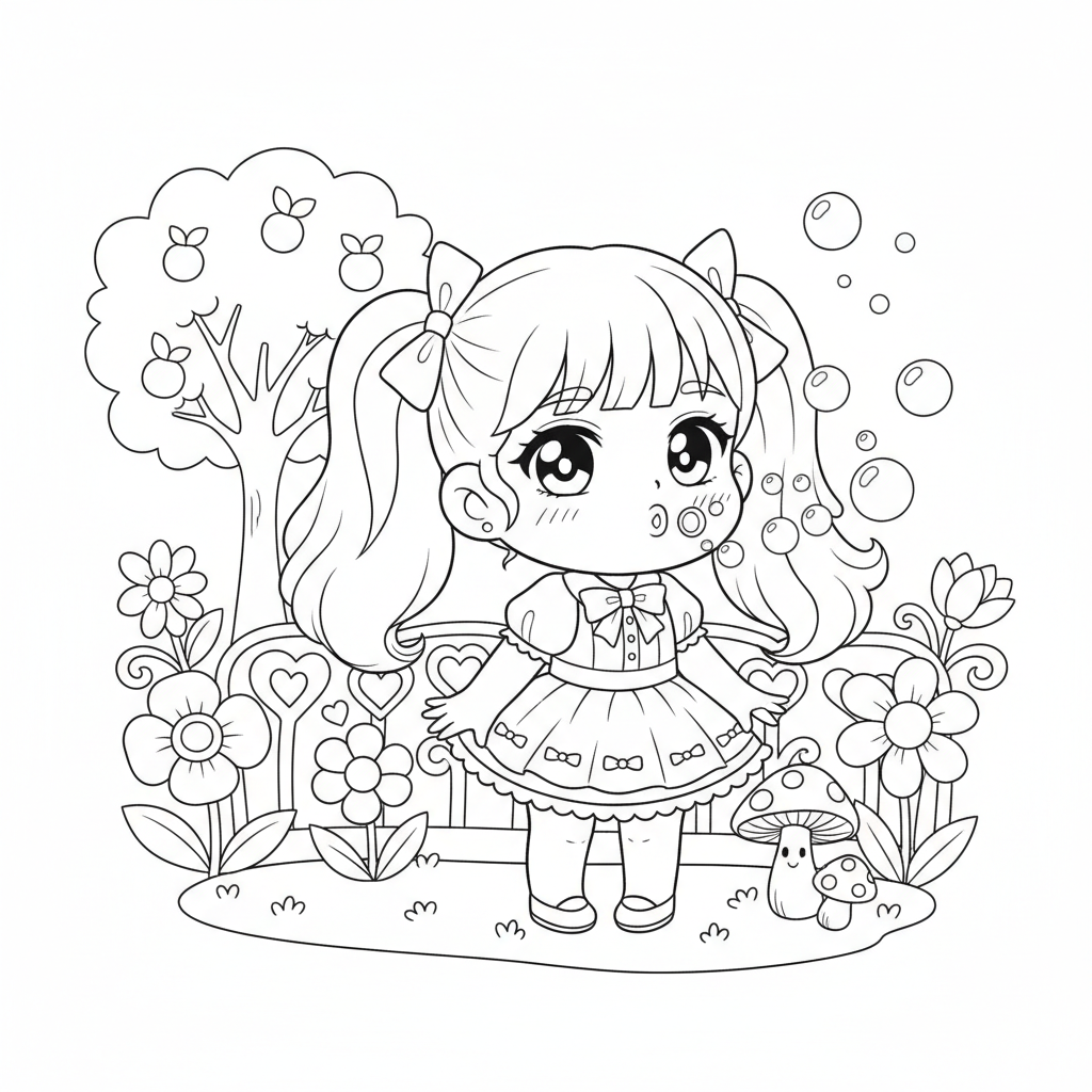 A delightful anime girl coloring page featuring chibi anime girl with twin tails blowing bubbles in a garden. Perfect for kids and adults who love coloring!