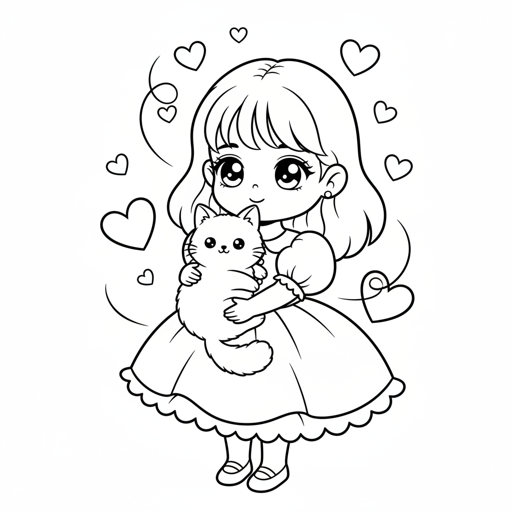 A delightful anime girl coloring page featuring kawaii anime girl holding a cat with hearts floating around. Perfect for kids and adults who love coloring!