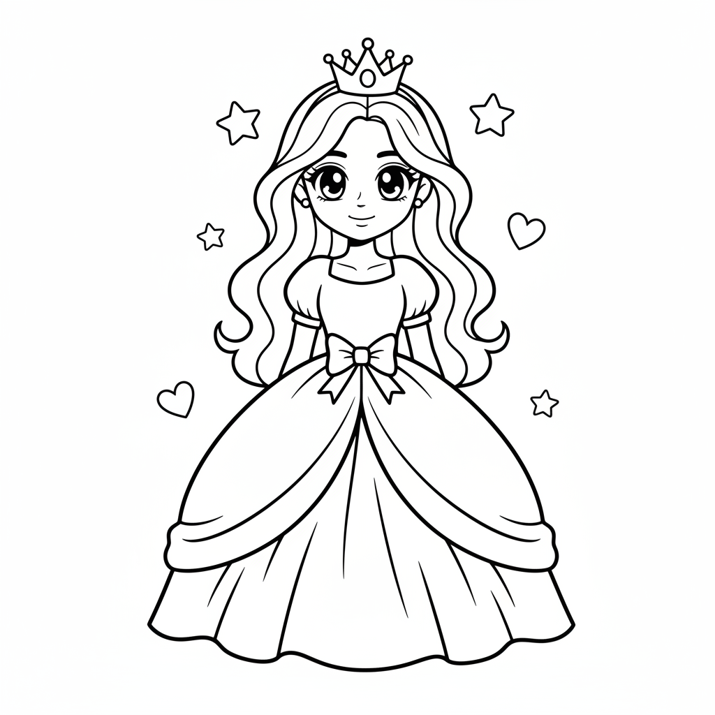 A delightful anime girl coloring page featuring simple anime girl in a princess dress with a small tiara. Perfect for kids and adults who love coloring!