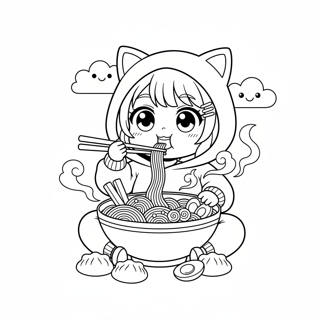 A delightful anime girl coloring page featuring tiny chibi anime girl eating a big bowl of ramen noodles. Perfect for kids and adults who love coloring!