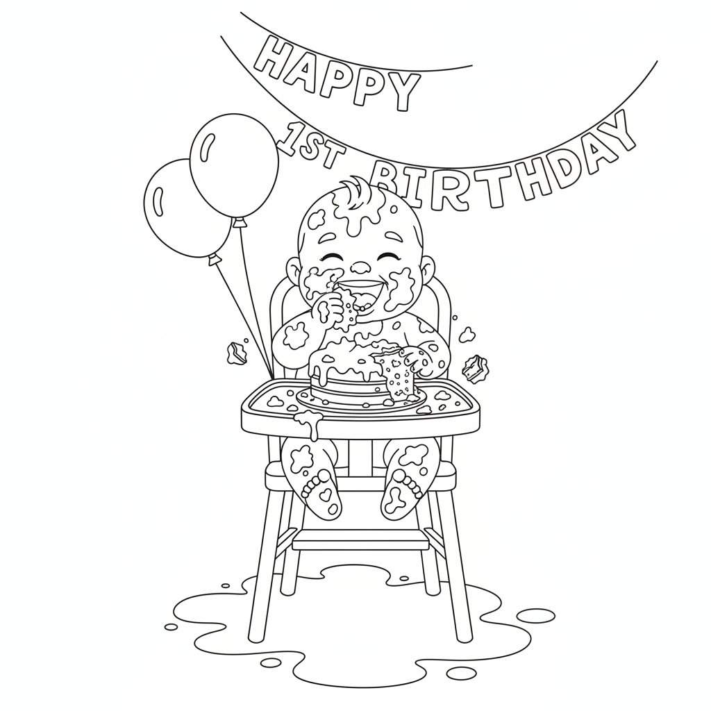 A delightful baby coloring page featuring baby in highchair eating messy first birthday cake smash. Perfect for kids and adults who love coloring!
