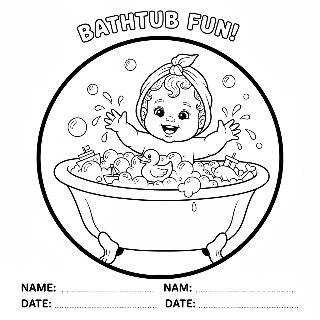 A delightful baby coloring page featuring baby playing with rubber duck in bubble bath fun. Perfect for kids and adults who love coloring!