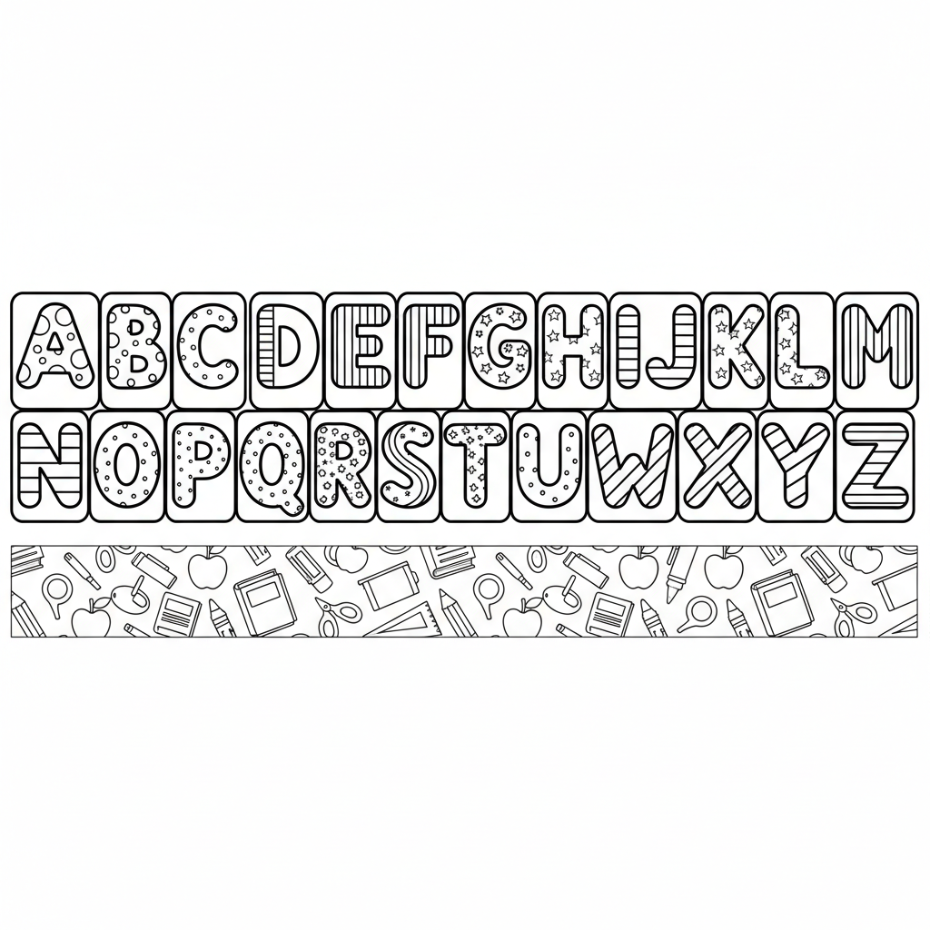 A delightful back to school coloring page featuring alphabet letters A to Z decorating classroom wall border. Perfect for kids and adults who love coloring!