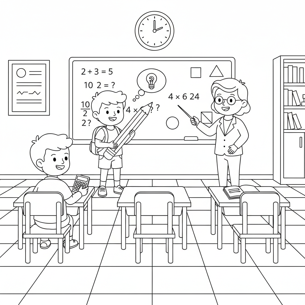 A delightful back to school coloring page featuring math class with numbers equations on whiteboard student solving. Perfect for kids and adults who love coloring!