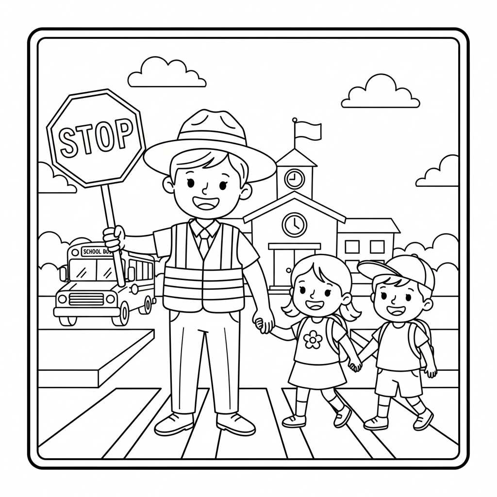 A delightful back to school coloring page featuring school crossing guard helping children cross street safely. Perfect for kids and adults who love coloring!