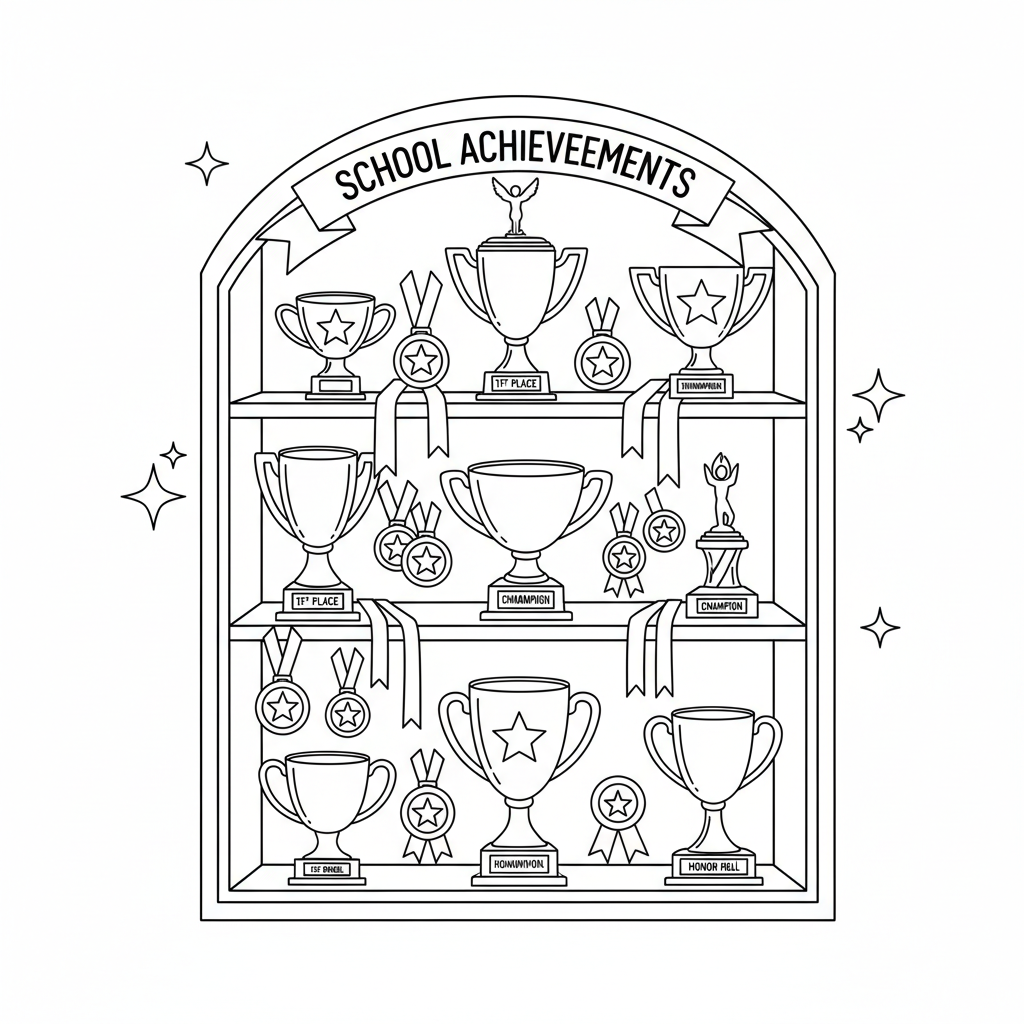 A delightful back to school coloring page featuring school trophy case with awards medals and ribbons display. Perfect for kids and adults who love coloring!