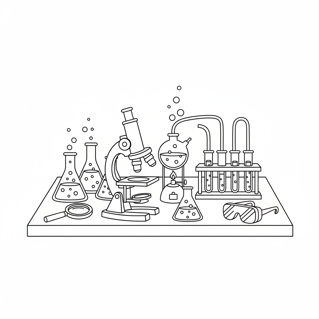 A delightful back to school coloring page featuring science lab with beakers test tubes microscope experiment setup. Perfect for kids and adults who love coloring!