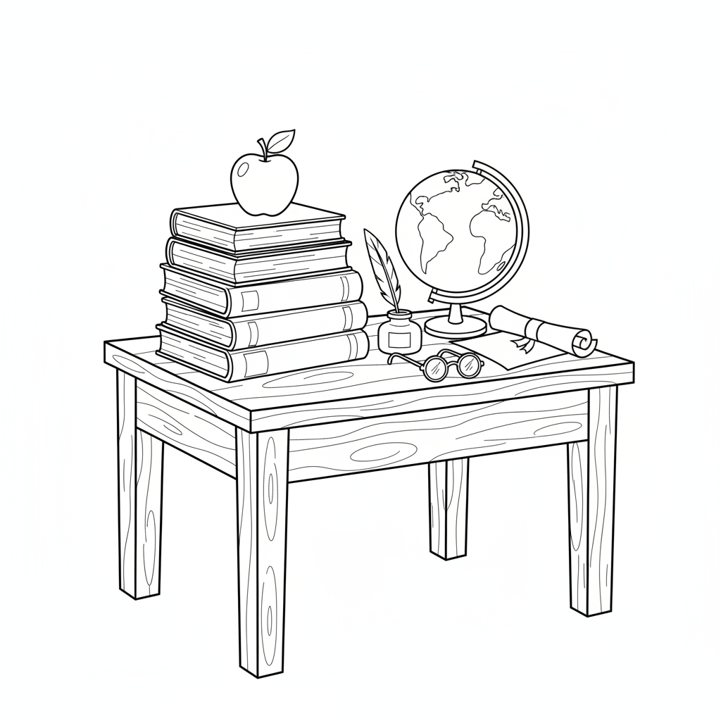 A delightful back to school coloring page featuring stack of textbooks with apple on top classic teacher desk scene. Perfect for kids and adults who love coloring!