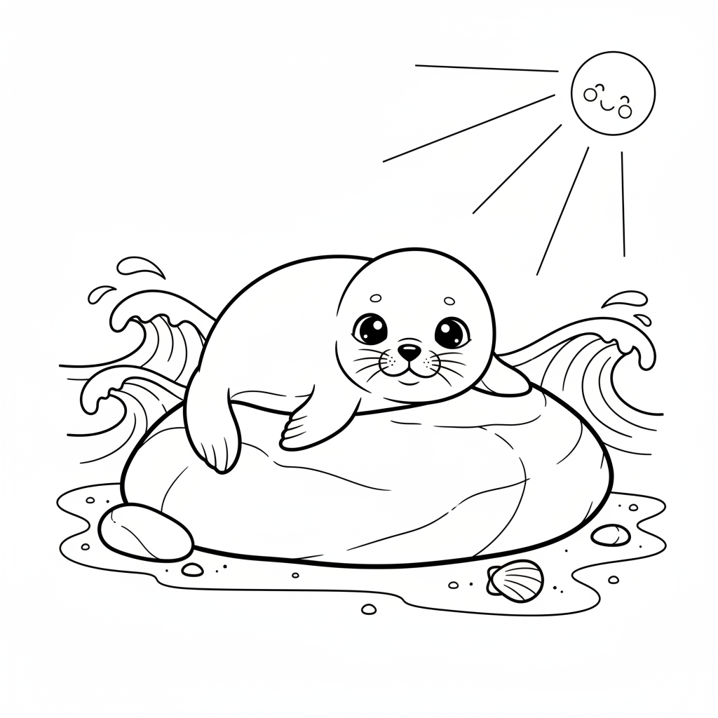 A delightful beach coloring page featuring adorable baby seal resting on a sunny beach rock near the water. Perfect for kids and adults who love coloring!
