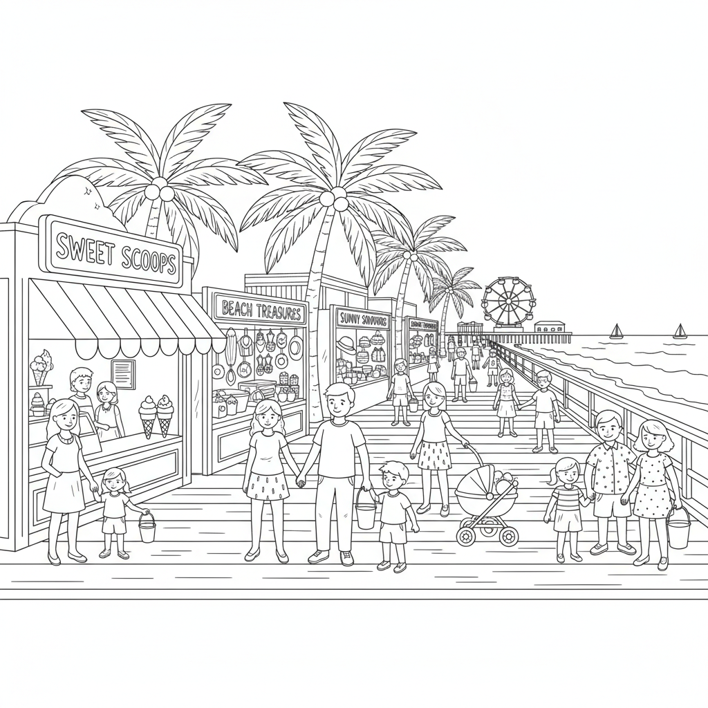 A delightful beach coloring page featuring beach boardwalk scene with ice cream shop souvenir stands and people walking. Perfect for kids and adults who love coloring!