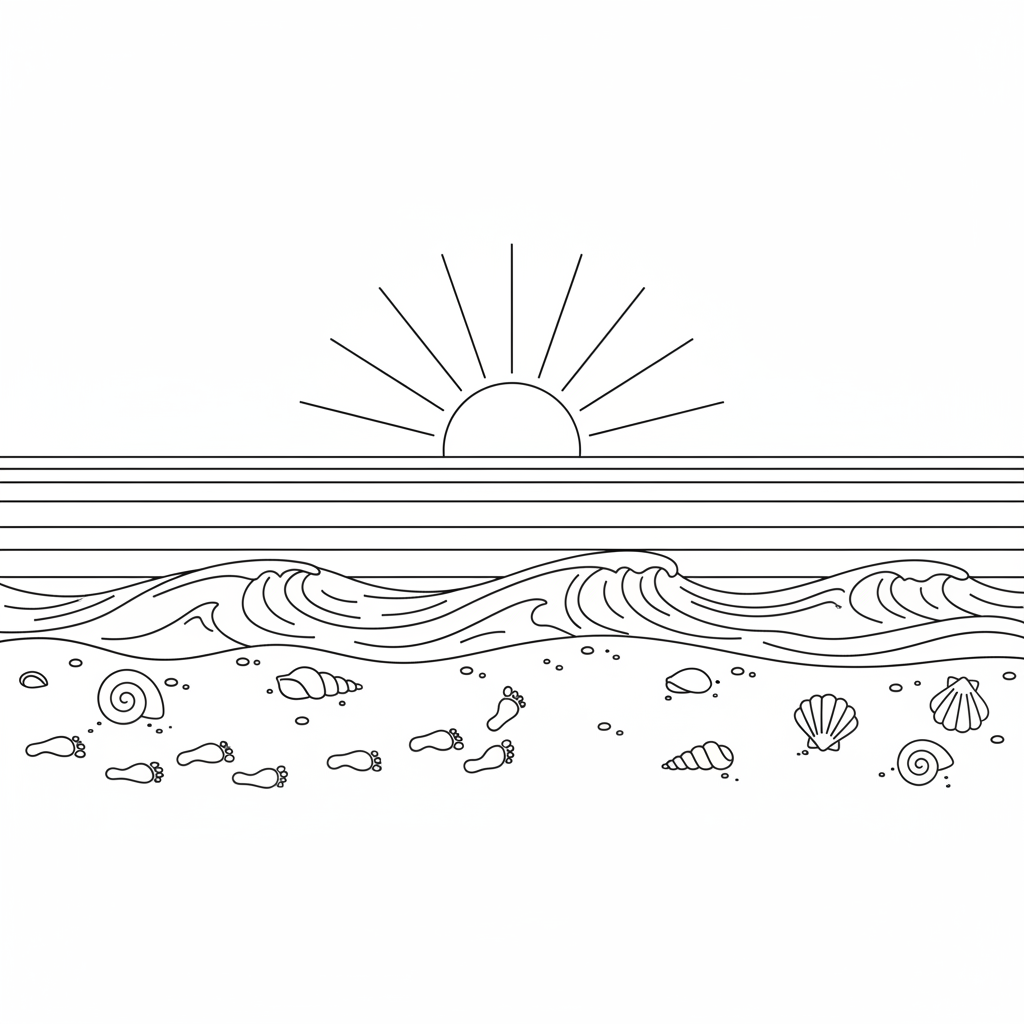 A delightful beach coloring page featuring beach sunrise panorama with gentle waves seashells and footprints in sand. Perfect for kids and adults who love coloring!