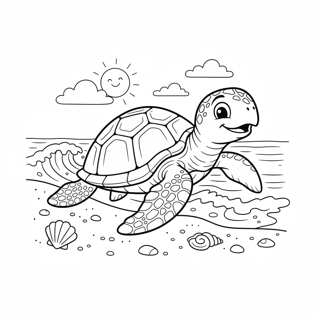 A delightful beach coloring page featuring big friendly sea turtle crawling across the sandy beach toward the ocean. Perfect for kids and adults who love coloring!