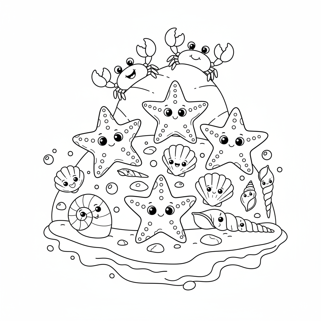 A delightful beach coloring page featuring cute cartoon starfish and seashells scattered along the shoreline. Perfect for kids and adults who love coloring!