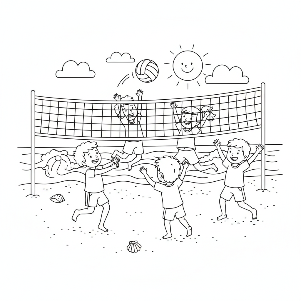 A delightful beach coloring page featuring group of children playing beach volleyball on the sand near the waves. Perfect for kids and adults who love coloring!