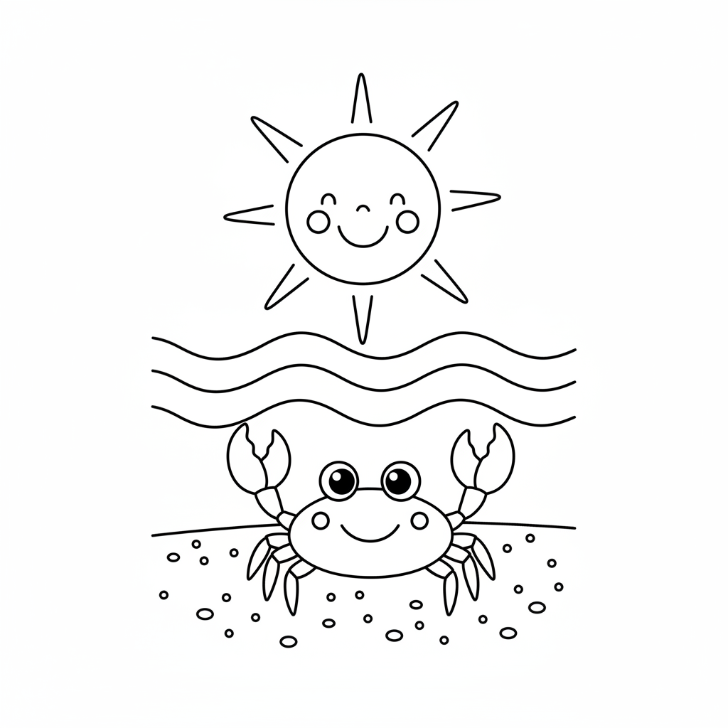 A delightful beach coloring page featuring simple smiling sun over calm ocean waves with a friendly crab on the sand. Perfect for kids and adults who love coloring!