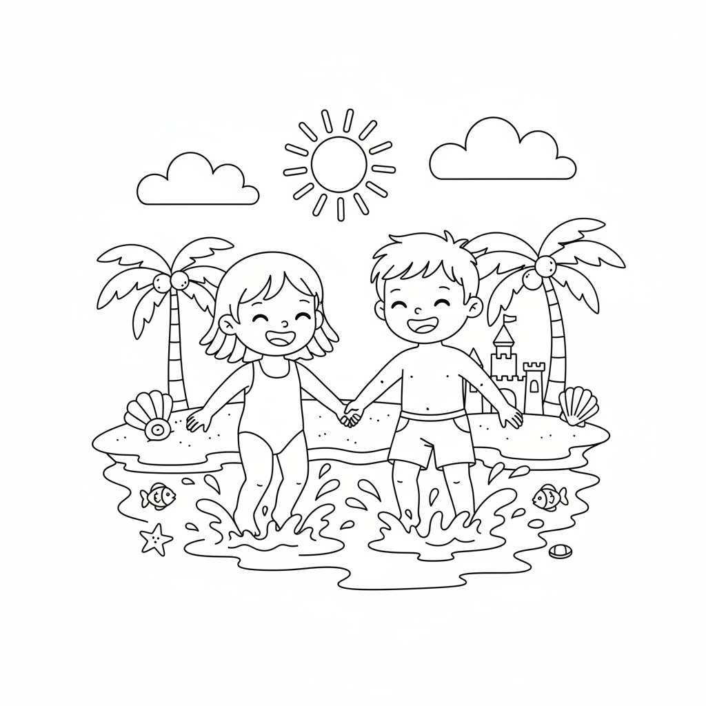 A delightful beach coloring page featuring two kids holding hands splashing in shallow beach water with big smiles. Perfect for kids and adults who love coloring!