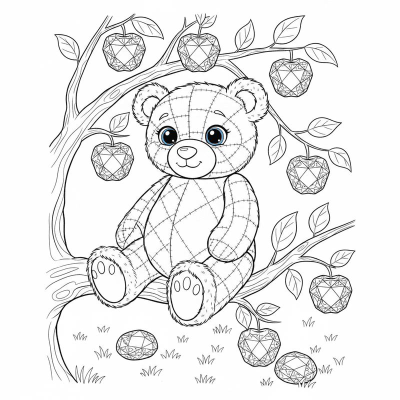 A quilted teddy bear with blue eyes and furry feet sitting in an apple tree with sapphire crystal ap
