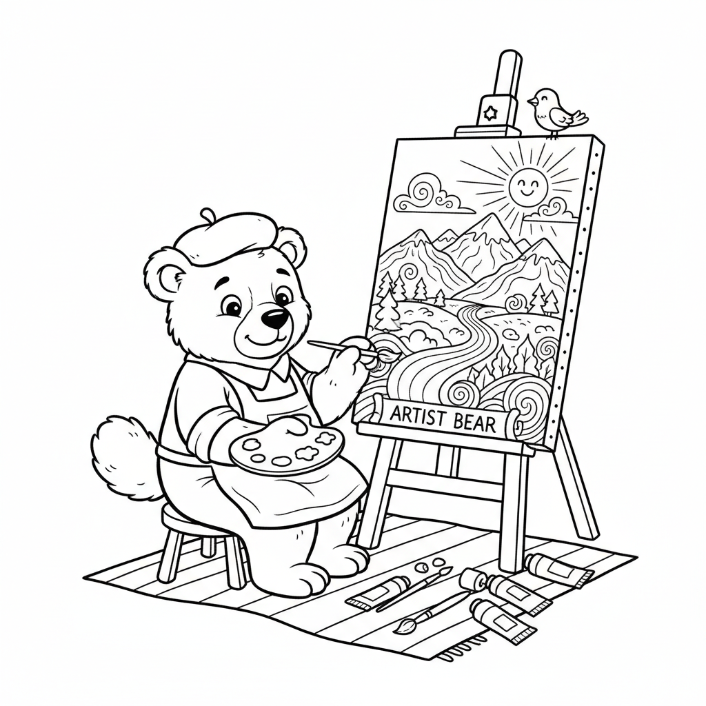 A delightful bear coloring page featuring bear artist painting beautiful landscape on canvas. Perfect for kids and adults who love coloring!