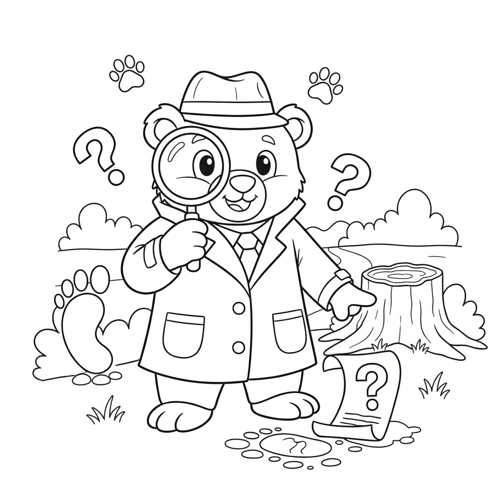 A delightful bear coloring page featuring bear detective with magnifying glass solving mystery. Perfect for kids and adults who love coloring!