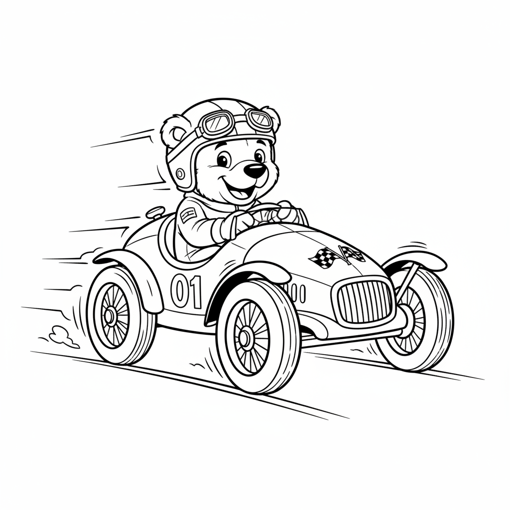 A delightful bear coloring page featuring bear race car driver in speeding race car. Perfect for kids and adults who love coloring!