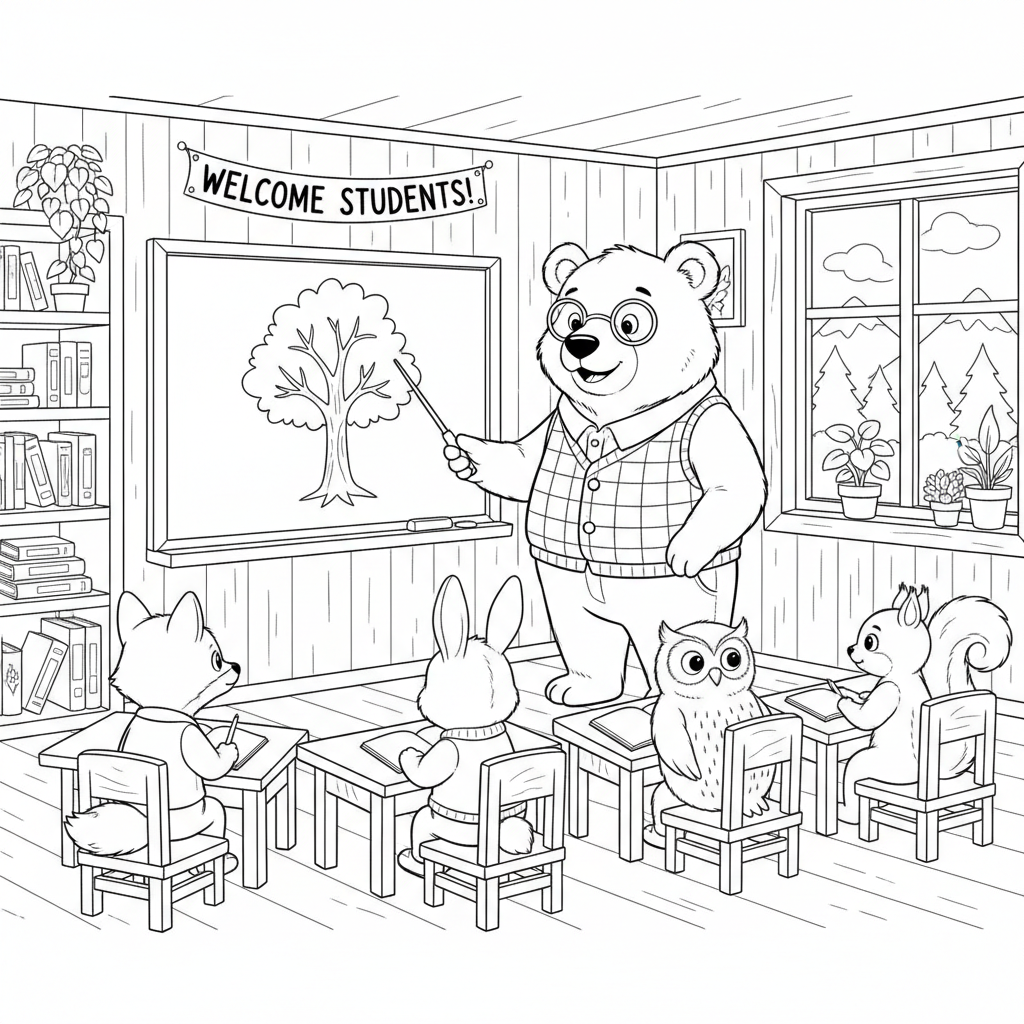 A delightful bear coloring page featuring bear teacher in classroom with forest animal students. Perfect for kids and adults who love coloring!