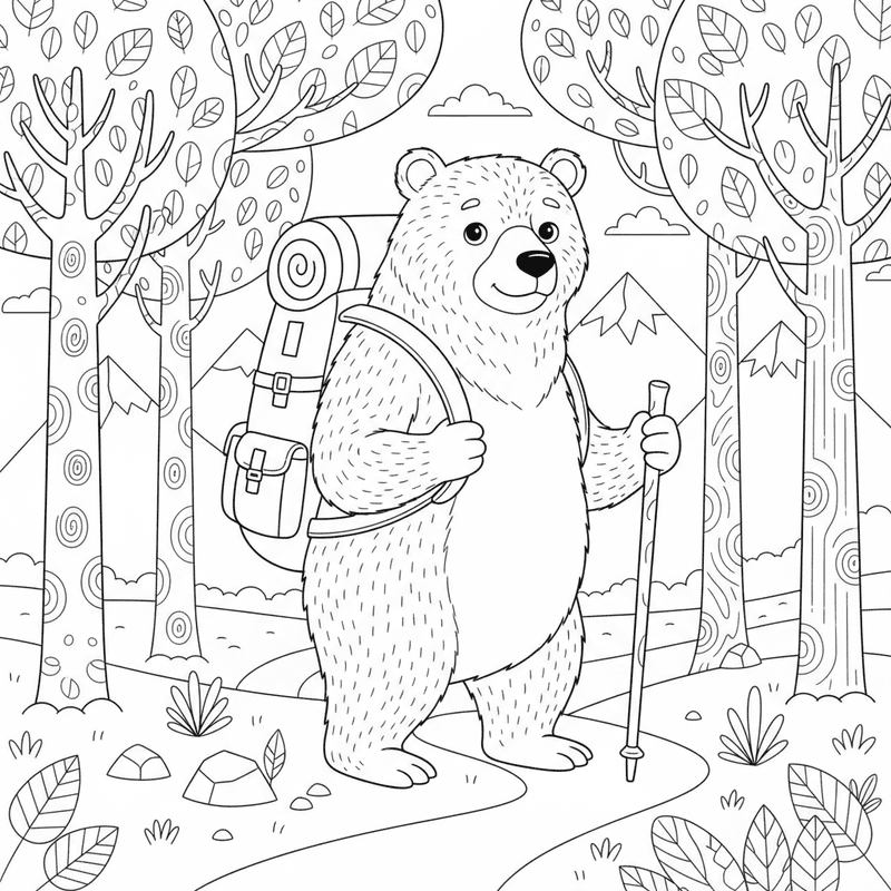Beautiful bear wearing backpack hiking coloring page for kids and adults. Free to download and print.