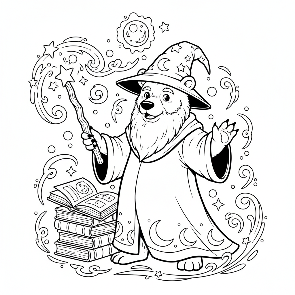 A delightful bear coloring page featuring bear wizard casting magical spell with wand. Perfect for kids and adults who love coloring!