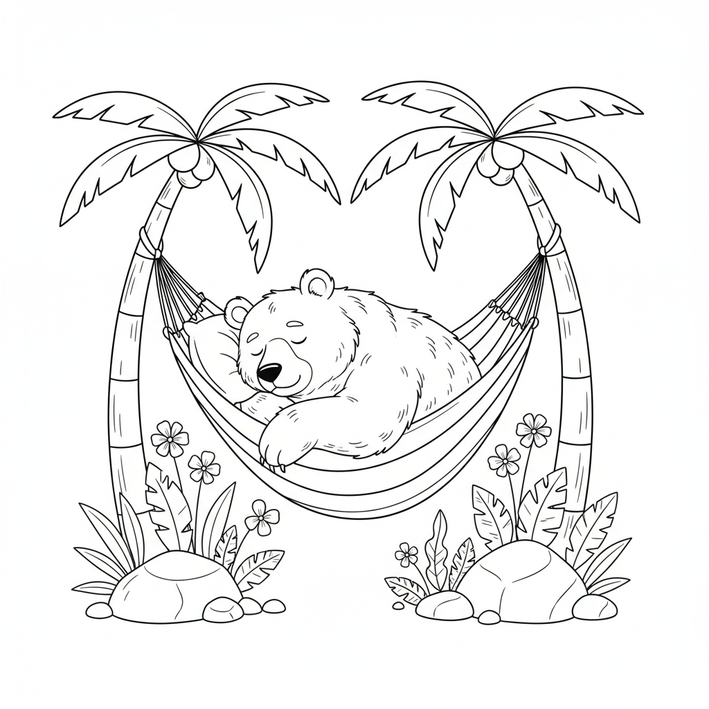 Beautiful sleepy bear in hammock coloring page for kids and adults. Free to download and print.