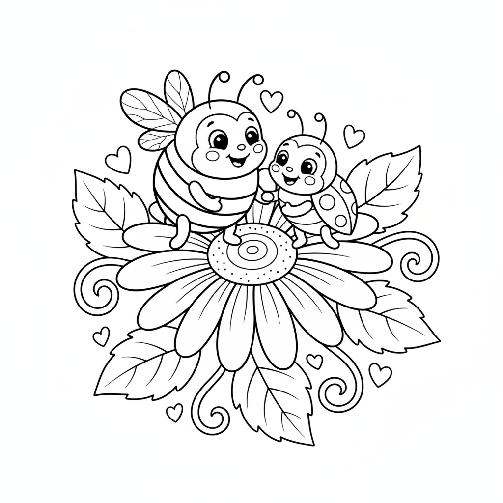 A delightful bee coloring page featuring bee and ladybug friends on flower. Perfect for kids and adults who love coloring!
