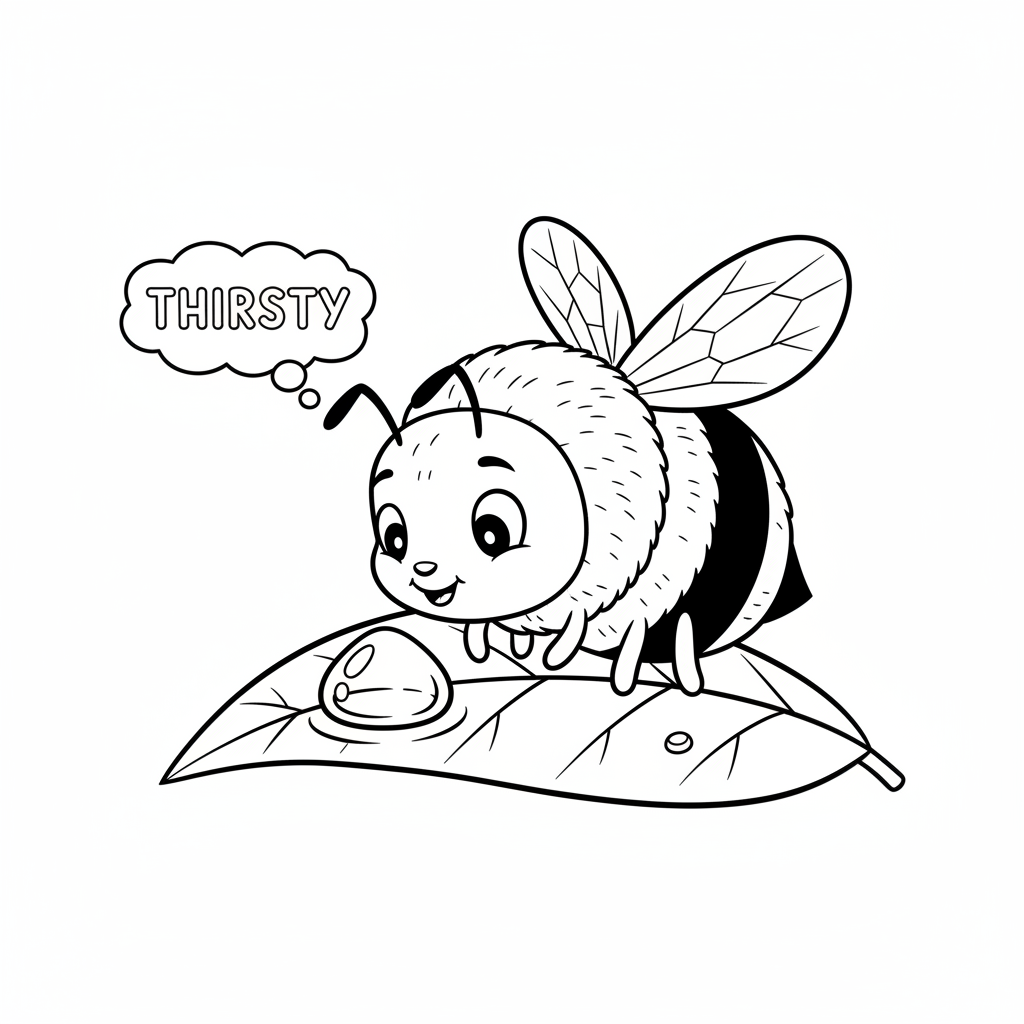 A delightful bee coloring page featuring bee drinking water from dewdrop thirsty. Perfect for kids and adults who love coloring!