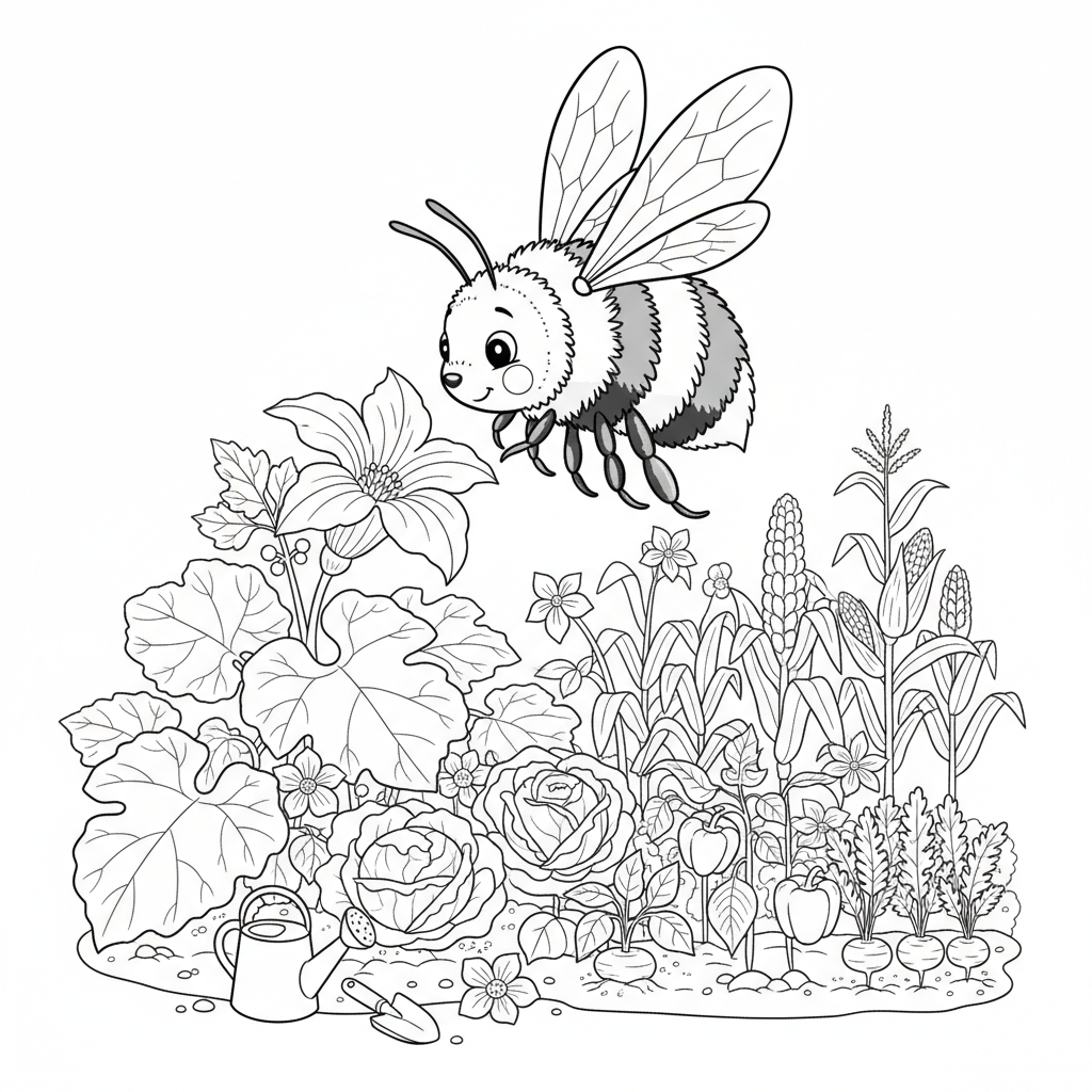 A delightful bee coloring page featuring bee pollinating vegetable garden helping. Perfect for kids and adults who love coloring!