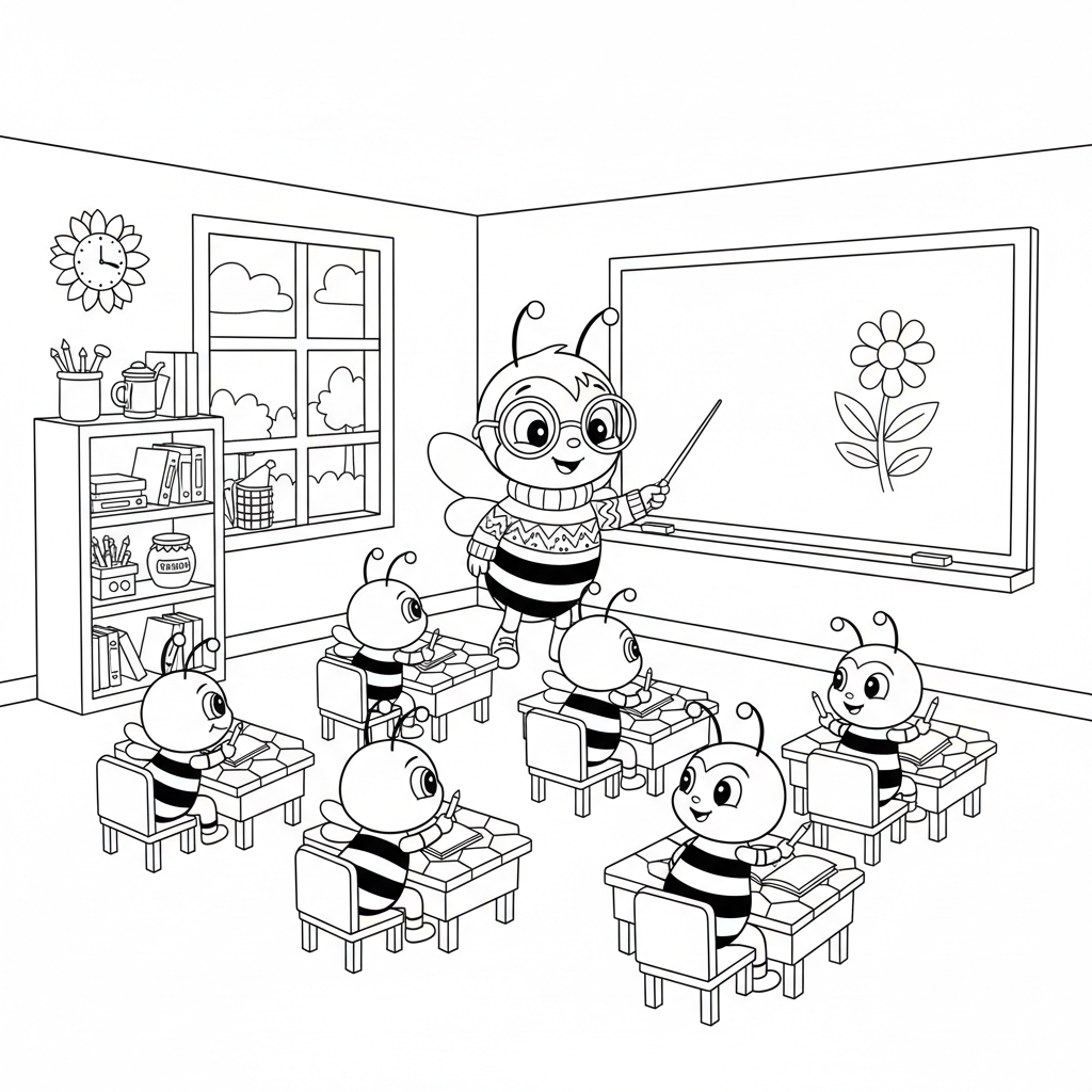 Beautiful bee teacher in classroom coloring page for kids and adults. Free to download and print.