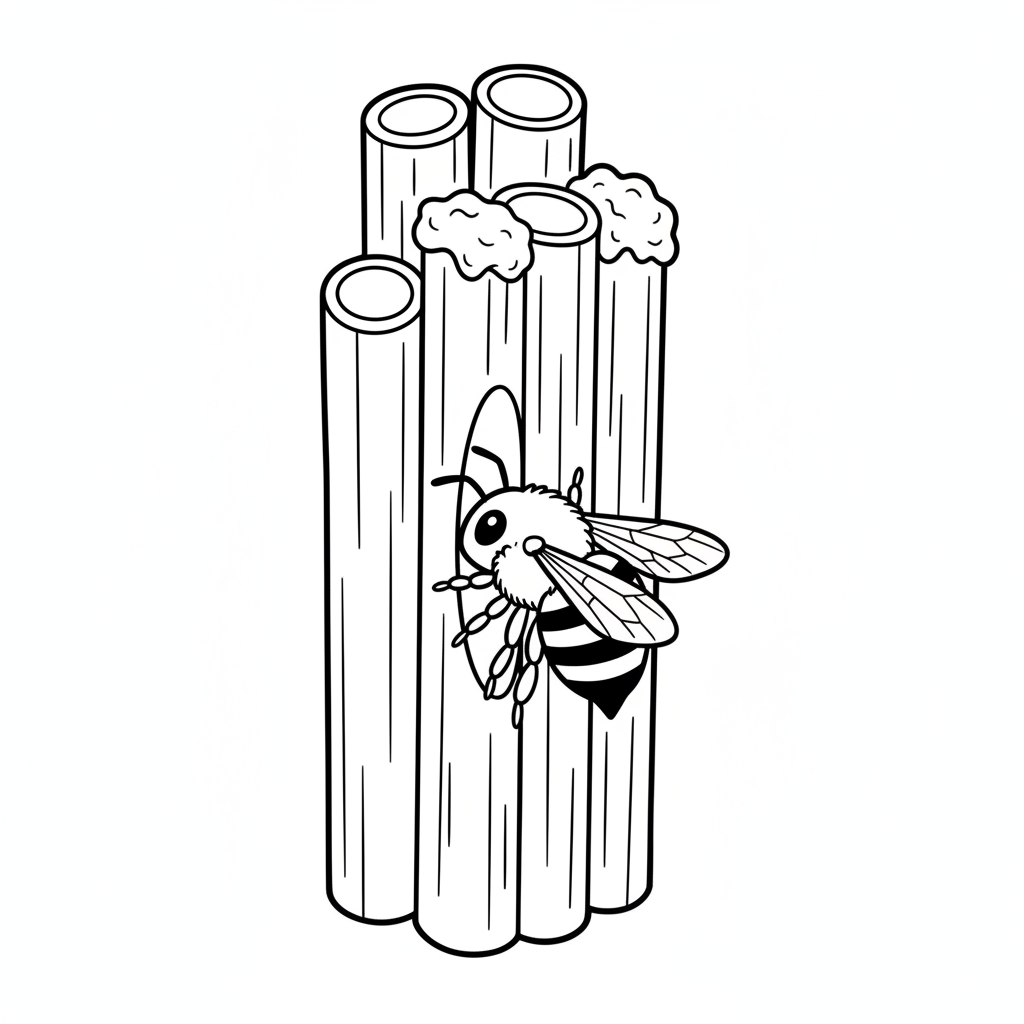 A delightful bee coloring page featuring mason bee entering tube nest home. Perfect for kids and adults who love coloring!