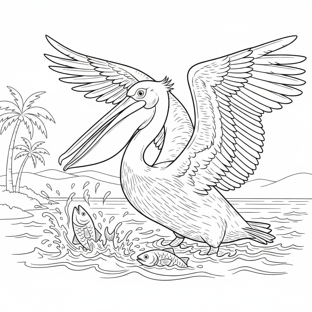 Beautiful pelican catching fish coloring page for kids and adults. Free to download and print.