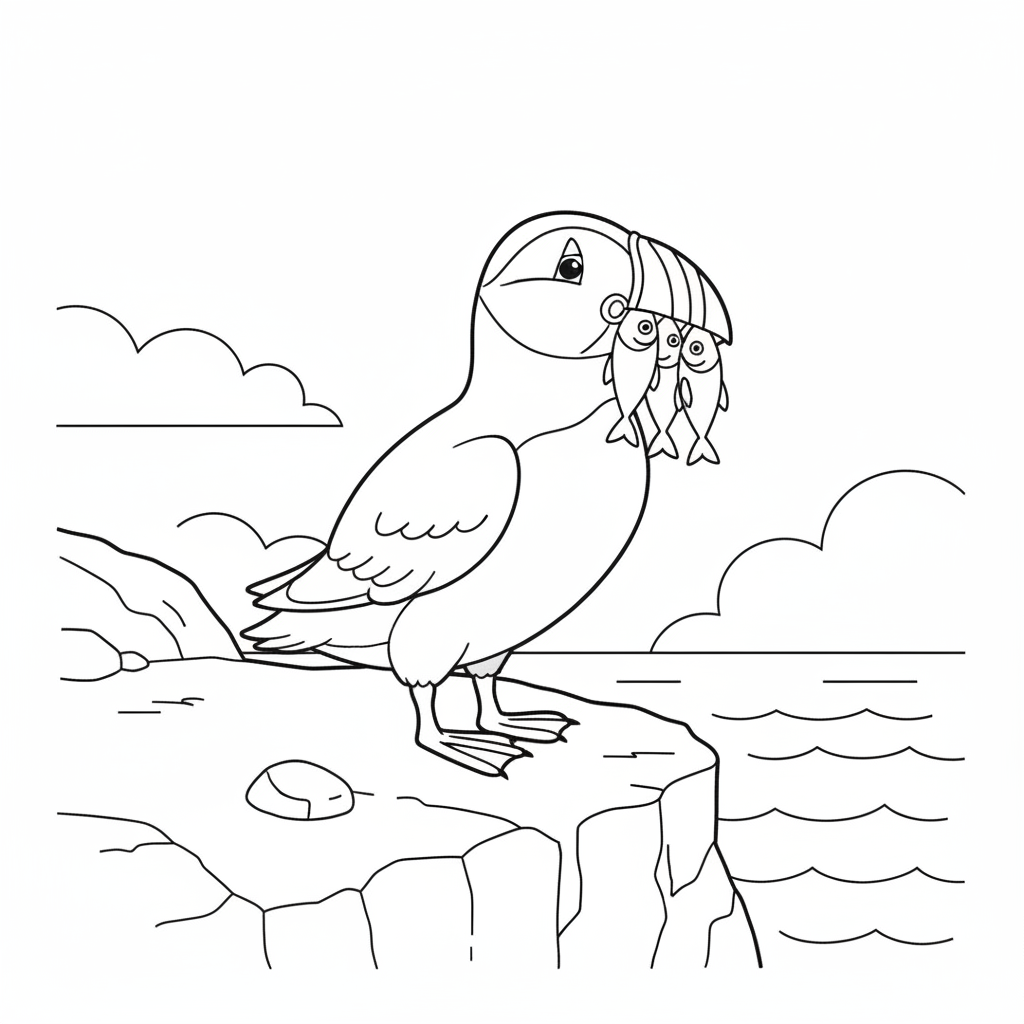 A delightful bird coloring page featuring puffin on cliff colorful beak fish. Perfect for kids and adults who love coloring!