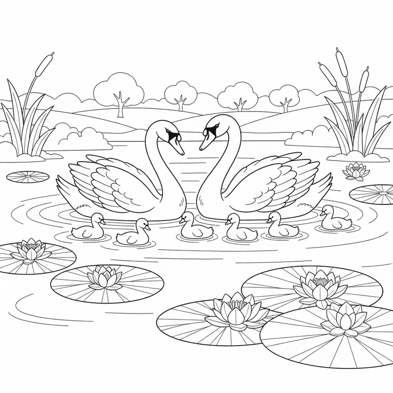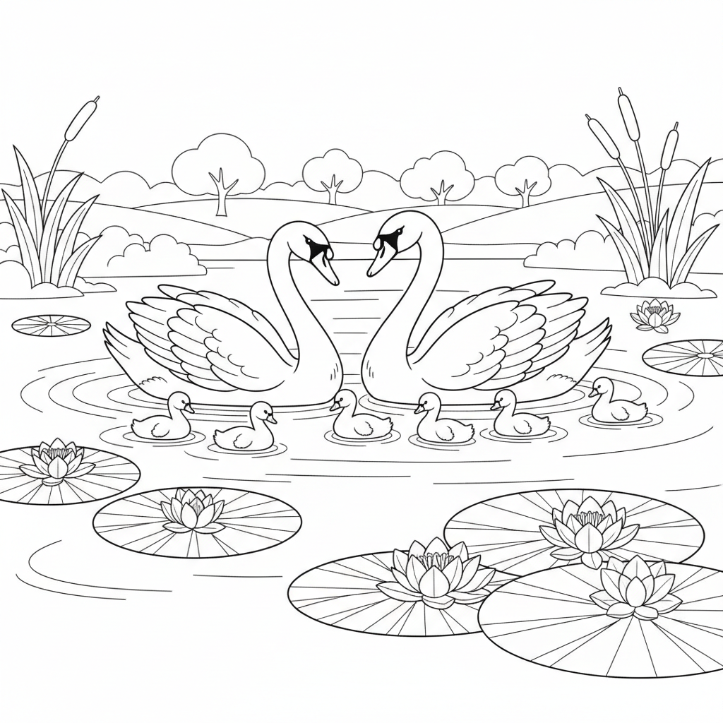 Beautiful swan family on pond coloring page for kids and adults. Free to download and print.