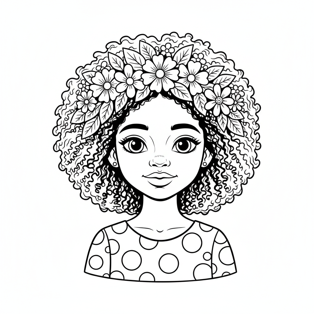 A delightful black girl coloring page featuring beautiful Black girl with natural afro hair and flowers crown. Perfect for kids and adults who love coloring!