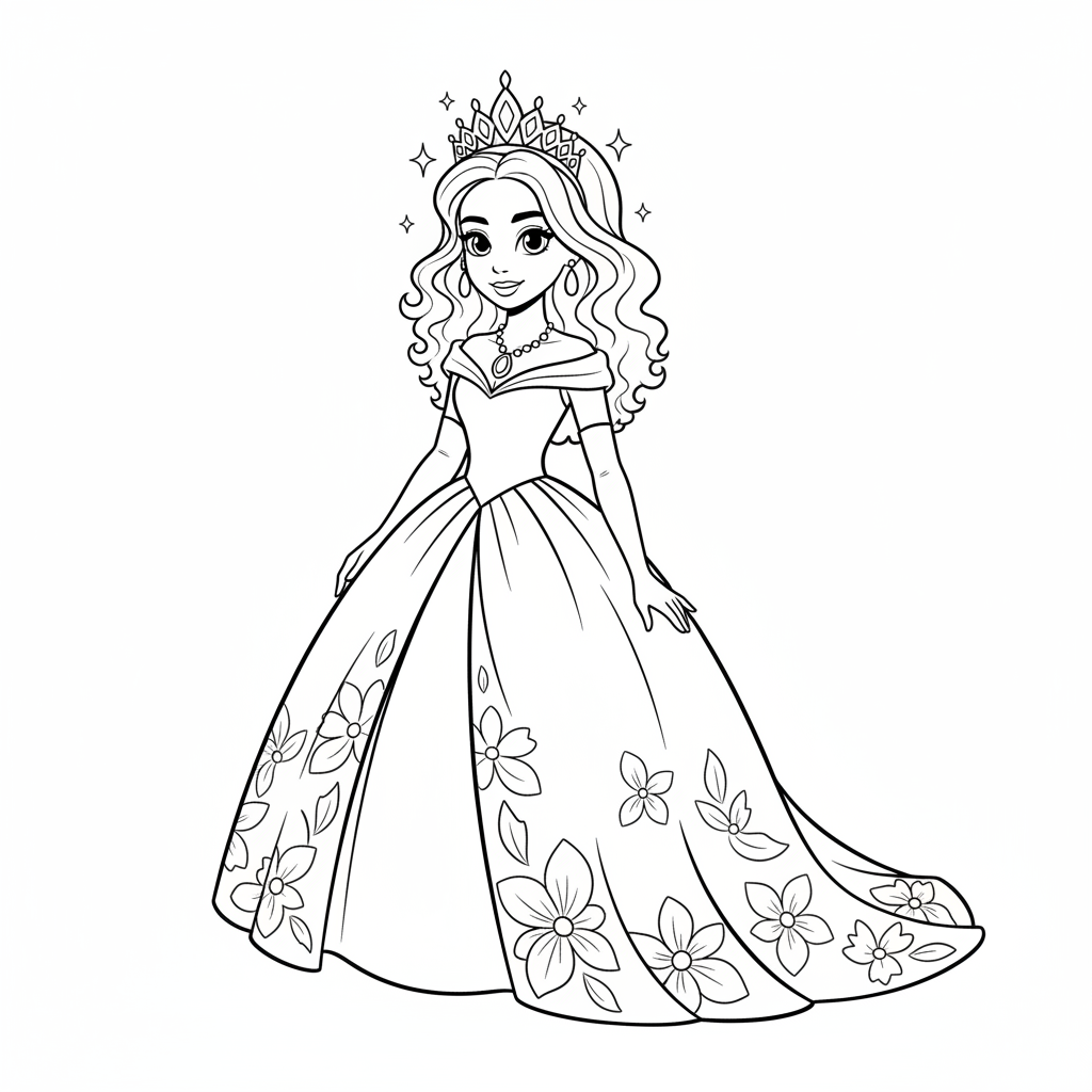 A delightful black girl coloring page featuring Black princess in gorgeous ballgown with sparkling tiara. Perfect for kids and adults who love coloring!
