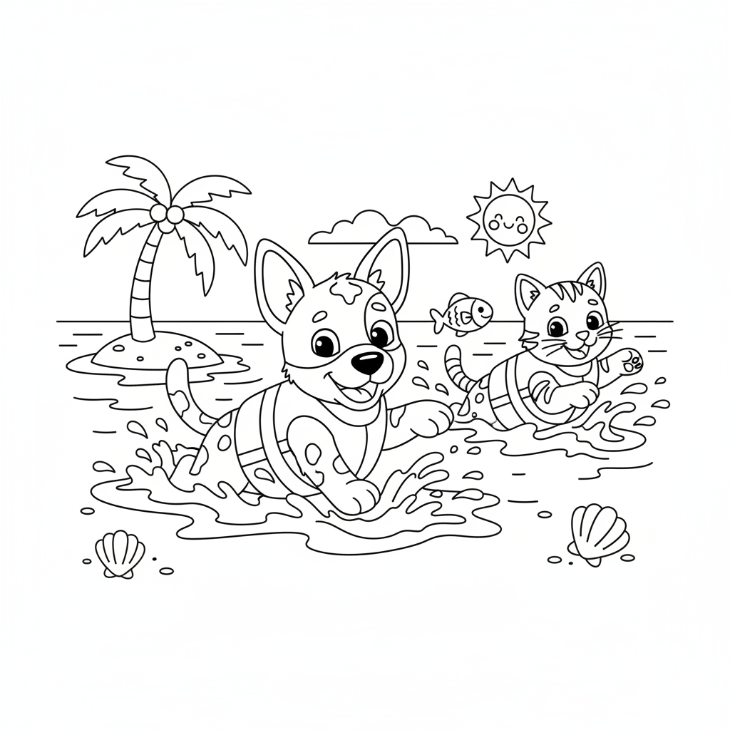 An original AI-generated fan art coloring page inspired by bluey, featuring a cartoon blue heeler puppy and friends swimming at beach. This is unofficial fan art, not affiliated with the original creators. Perfect for kids and adults who love coloring!