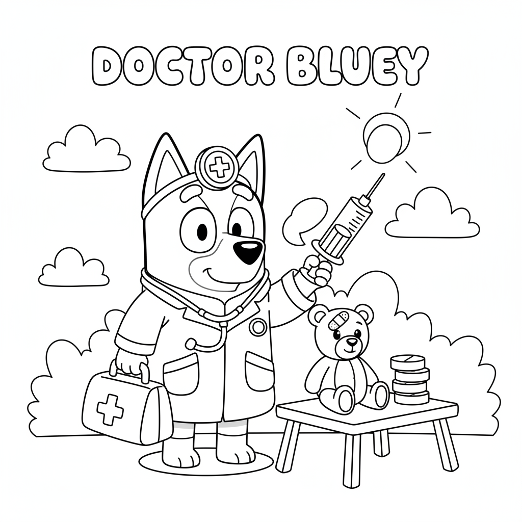 An original AI-generated fan art coloring page inspired by bluey, featuring a cartoon blue heeler puppy playing pretend doctor game. This is unofficial fan art, not affiliated with the original creators. Perfect for kids and adults who love coloring!